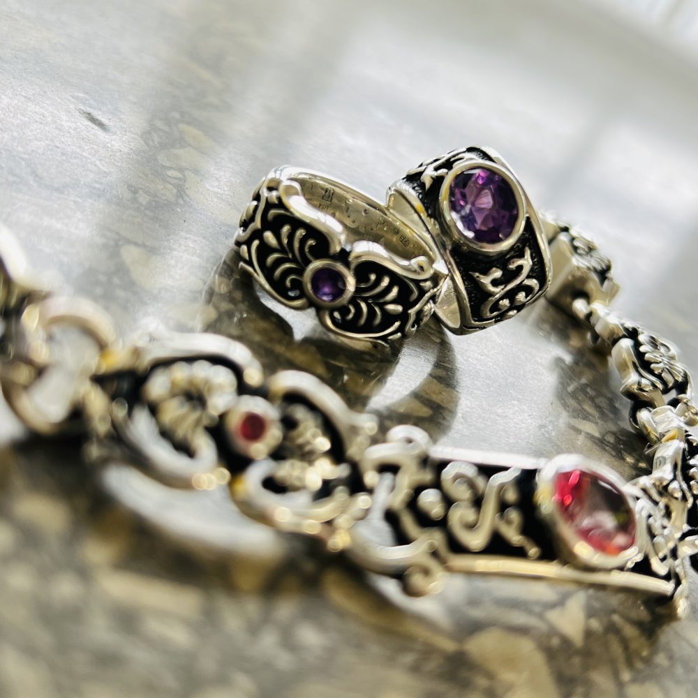 中央にストーンをセットし、流麗な彫金とストーンのメリハリが美しい鉄板デザインですが、